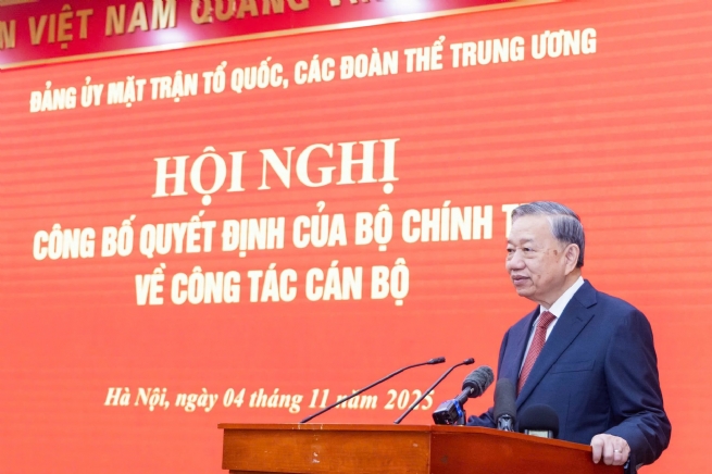 Tổng Bí thư Tô Lâm phát biểu tại Hội nghị. Ảnh: Mặt trận Tổ quốc, các đoàn thể Trung ương