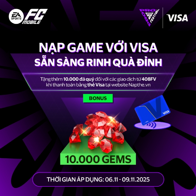 Bên cạnh đó, Visa và Sacombank sẽ mang đến trải nghiệm thanh toán liền mạch, ưu đãi độc quyền dành cho chủ thẻ Visa, và các hoạt động gắn kết người hâm mộ với bóng đá và công nghệ một cách sáng tạo. Trong khuôn khổ Lễ hội, chủ thẻ Visa thực hiện lần nạp tiền đầu tiên từ 200.000 VNĐ (tương đương 408 FV) trở lên thông qua website napthe.vn trong EA SPORTS FC™ Mobile sẽ nhận được 10.000 Gems như một phần quà. Chương trình khuyến mãi có thời hạn này khuyến khích người tiêu dùng giao dịch an toàn và tiện lợi, đồng thời mở khóa thêm các đặc quyền cho cộng đồng game thủ và người hâm mộ bóng đá sôi động tại Việt Nam.