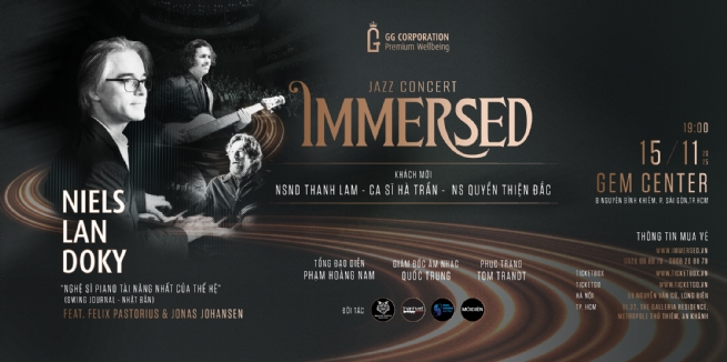 Từ 19:00 cùng ngày, đêm nhạc Jazz Concert – IMMERSED sẽ chính thức diễn ra tại GEM Center, TPHCM. Đêm nhạc Jazz Concert – IMMERSED là sự kiện có sự góp mặt của nghệ sĩ piano Jazz đẳng cấp thế giới Niels Lan Doky – Hiệp sĩ Hoàng gia Đan Mạch, người từng được Swing Journal vinh danh là "Nghệ sĩ Piano tài năng nhất thế hệ". Ông sẽ trình diễn cùng bộ đôi nghệ sĩ quốc tế Felix Pastorius (bass) và Jonas Johansen (trống), cùng những tiết mục kết hợp độc đáo với những nghệ sĩ lừng danh tại Việt Nam như NSND Thanh Lam, ca sĩ Hà Trần, nghệ sĩ saxophone Quyền Thiện Đắc, NSND Hoàng Anh, nhạc sĩ Hồ Hoài Anh… Chương trình được đặc biệt dàn dựng và thiết kế bởi đội ngũ sáng tạo gồm Tổng đạo diễn Phạm Hoàng Nam, Giám đốc Âm nhạc Quốc Trung và Nhà thiết kế Phục trang Tom Trandt. Tất cả sẽ mang đến một không gian giao thoa thú vị giữa jazz quốc tế và âm hưởng Việt Nam đương đại.