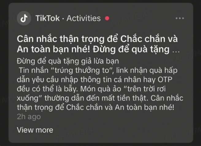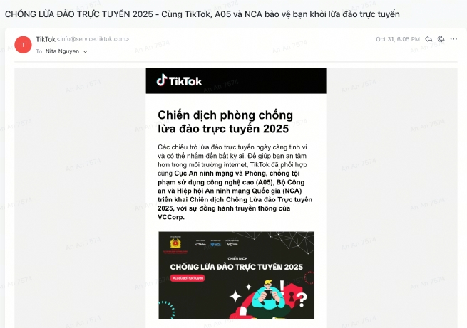 Đầu tháng 10/2025, nền tảng TikTok phối hợp cùng Cục An ninh mạng và Phòng, chống tội phạm sử dụng công nghệ cao (A05 – Bộ Công An) và Hiệp hội An ninh mạng Quốc gia (NCA) khởi động chiến dịch “Phòng chống lừa đảo trực tuyến 2025”, hướng đến việc nâng cao nhận thức cộng đồng về an toàn mạng, giúp người dùng nhận biết và phòng tránh các hình thức lừa đảo trực tuyến ngày càng tinh vi. Xem thêm thông tin tại đây.