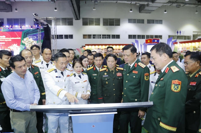 Thượng tướng Nguyễn Trường Thắng và Thượng tướng Vongsone Inpanphim tham quan khu triển lãm của Tổng công ty Tân Cảng Sài Gòn