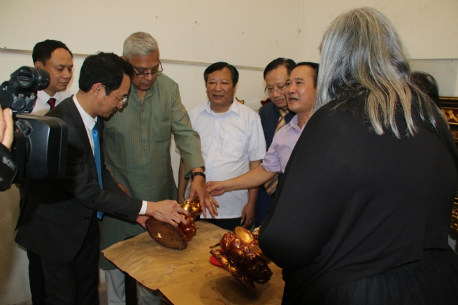 Ông Sundeep Kumar, Phó Chủ tịch Hội đồng Thủ công Thế giới khu vực châu Á – Thái Bình Dương ấn tượng về các sản phẩm của làng nghề Sơn Đồng