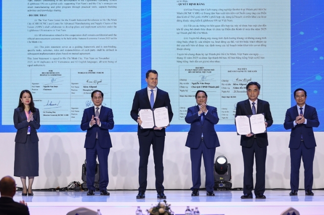 Thủ tướng Chính phủ chứng kiến trao Bản ghi nhớ (MOU) về hợp tác giữa TPHCM và Diễn đàn Kinh tế Thế giới (WEF) về sáng kiến thúc đẩy sản xuất thông minh và chuyển đổi công nghiệp có trách nhiệm tại Việt Nam - Ảnh: VGP/Nhật Bắc