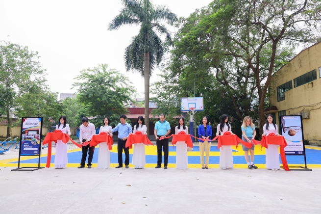 Đại diện AstraZeneca Việt Nam, các đối tác và học sinh cùng cắt băng khánh thành sân chơi thể thao trong khuôn khổ Chương trình Sức khỏe Thanh thiếu niên (YHP), khuyến khích hoạt động thể chất và lối sống lành mạnh