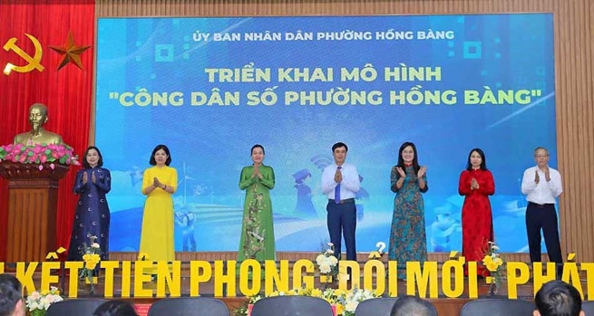 Các đồng chí: Lê Thị Vân - Phó Bí thư Thường trực Đảng ủy, Chủ tịch HĐND phường; Phạm Văn Đoan - Chủ tịch UBND phường cùng đại biểu nhấn nút triển khai mô hình“Công dân số Hồng Bàng”