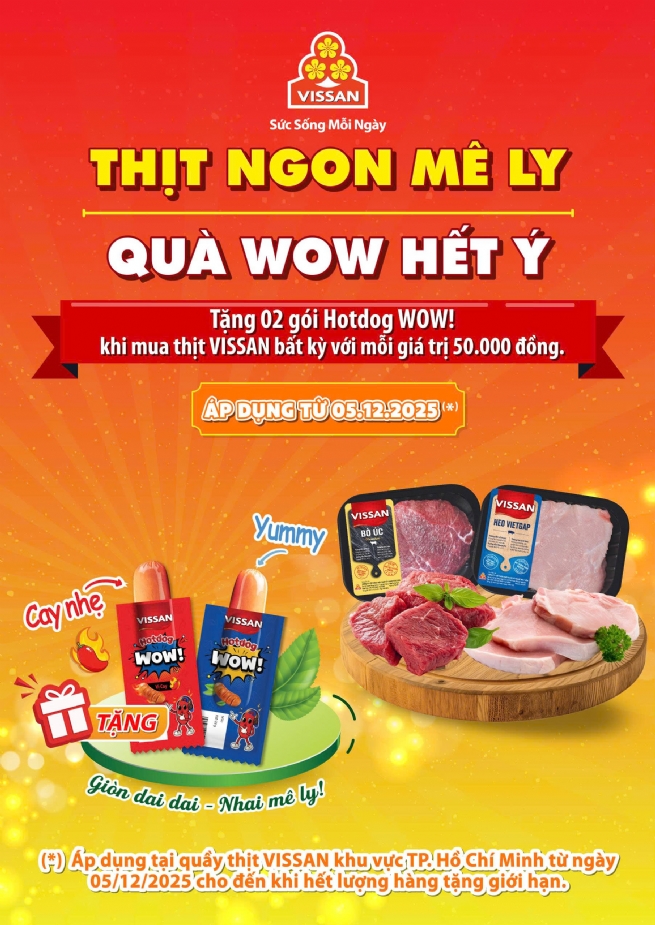 Quà tặng thiết thực: Tặng ngay 02 gói Hotdog WOW khi mua thịt tươi sống trị giá từ 50.000 đồng tại quầy thịt VISSAN thuộc hệ thống siêu thị Saigon Coop, Satra, Vincomerce, Osifood khu vực TP.HCM; hoặc tặng 01 hũ Mỡ heo Bếp Việt cho hóa đơn thịt trị giá từ 200.000 đồng tại quầy thịt VISSAN trong hệ thống siêu thị AEON Citimart.