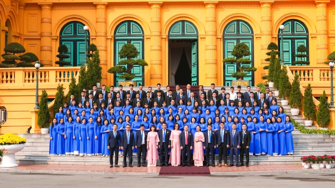 Đoàn cán bộ công nhân viên May 10 chụp ảnh lưu niệm bên Phủ Chủ tịch