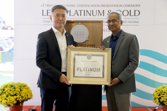 Ông Gopalakrishnan (phải) trao chứng nhận LEED Platinum cho khối văn phòng và căn hộ dịch vụ của Saigon Centre cho Ông Lim Kay Siong