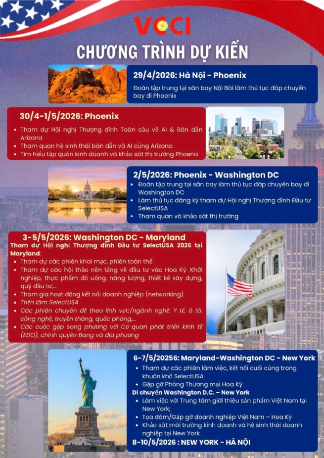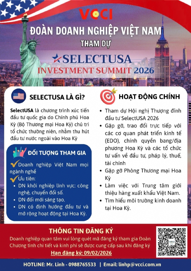 Nhằm hỗ trợ doanh nghiệp Việt Nam tìm hiểu môi trường đầu tư, mở rộng hoạt động kinh doanh và hiện diện tại thị trường Hoa Kỳ, đồng thời tạo điều kiện để doanh nghiệp tiếp cận trực tiếp với các cơ quan xúc tiến đầu tư, chính quyền bang và địa phương của Hoa Kỳ, Liên đoàn Thương mại và Công nghiệp Việt Nam (VCCI) dự kiến tổ chức Đoàn doanh nghiệp Việt Nam tham dự Hội nghị Thượng đỉnh Đầu tư Hoa Kỳ 2026 - SelectUSA Investment Summit 2026 ( SelectUSA 2026), kết hợp chương trình làm việc, kết nối và khảo sát thị trường tại một số trung tâm kinh tế lớn của Hoa Kỳ.