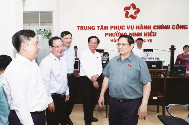 Thủ tướng Phạm Minh Chính kiểm tra, động viên đội ngũ cán bộ, công chức đang làm nhiệm vụ và người dân tới làm thủ tục tại Trung tâm Phục vụ hành chính công phường Ninh Kiều, tháng 7/2025