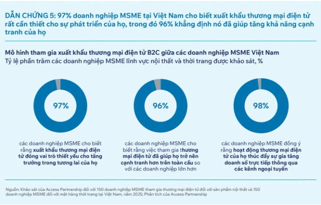 Theo nghiên cứu của Access Partnership, 97% doanh nghiệp MSME trong ngành nội thất và thời trang được khảo sát cho rằng xuất khẩu thương mại điện tử đóng vai trò thiết yếu cho tăng trưởng trong tương lai của họ, trong khi 96% ghi nhận việc ứng dụng thương mại điện tử giúp nâng cao năng lực cạnh tranh toàn cầu.