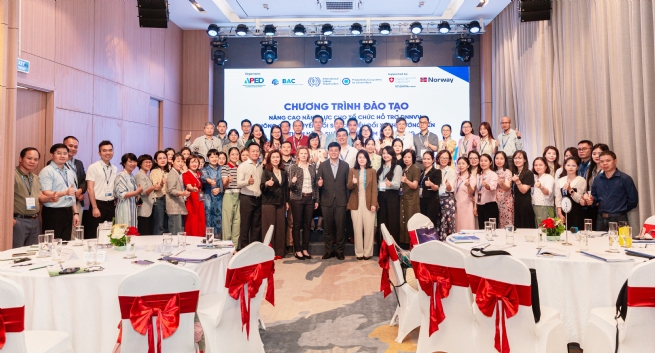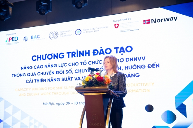 Khóa đào tạo được tổ chức diễn ra trực tiếp trong 02 ngày tại Tp.Hà Nội, với mục tiêu nâng cao năng lực cho các bộ hỗ trợ doanh nghiệp tại các địa phương, các tổ chức hiệp hội về xu hướng thị trường hướng tới tính bền vững; nâng cao năng lực về chuyển đổi số, kinh nghiệm tư vấn thực tiễn trong ngành sản xuất; nâng cao nhận thức về năng suất xanh; an toàn lao động và cải thiện điều kiện làm việc trong ngành sản xuất hướng đến cải thiện năng suất và việc làm thỏa đáng thông qua các nội dung trong khóa đào tạo như: Liên kết giữa Năng suất - Chuyển đổi số - Chuyển đổi xanh - Điều kiện làm việc; vai trò của đánh giá nhu cầu trong thiết kế chương trình hỗ trợ DNNVV; giới thiệu các bộ công cụ đánh giá; Xu hướng thị trường và yêu cầu mới trong tăng trưởng xanh và phát triển bền vững: tiếp cận từ yêu cầu pháp lý, chuỗi cung ứng và hội nhập quốc tế; các giải pháp chuyển đổi xanh trọng tâm và khả thi giúp doanh nghiệp tiết kiệm nguyên liệu, giảm hao hụt; tăng hiệu quả sử dụng năng lượng; quản lý chất thải, sản xuất sạch hơn; giới thiệu mô hình SCORE trong hỗ trợ doanh nghiệp; cách thức huy động các nguồn lực (tài chính, con người, công nghệ,…); thách thức trong thiết lập mạng lưới doanh nghiệp địa phương. Xây dựng, hướng dẫn xây dựng chương trình hỗ trợ doanh nghiệp mẫu;…