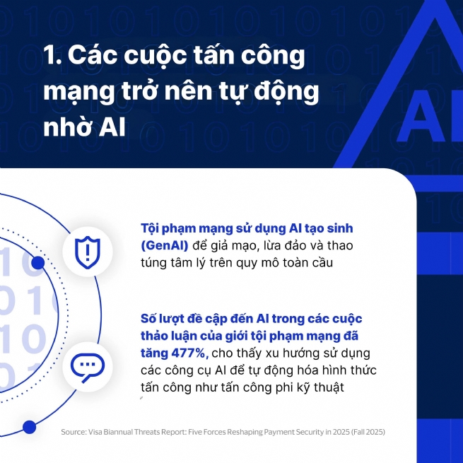 Visa ghi nhận số lượt đề cập đến tác nhân AI trên các diễn đàn ngầm đã tăng hơn 477%2 trong năm 2024, phản ánh mức độ quan tâm và mức độ ứng dụng ngày càng sâu rộng của công nghệ trong thế giới tội phạm mạng. AI tạo sinh cho phép tự động hóa hàng loạt hành vi như giả mạo danh tính, lừa đảo tinh vi, đánh cắp thông tin xác thực và phát tán mã độc. Một ví dụ điển hình là vụ lừa đảo deepfake tại Hồng Kông, khi nhân viên của một tập đoàn đa quốc gia bị dẫn dụ qua cuộc gọi video giả mạo, gây thiệt hại lên tới 25 triệu USD³.