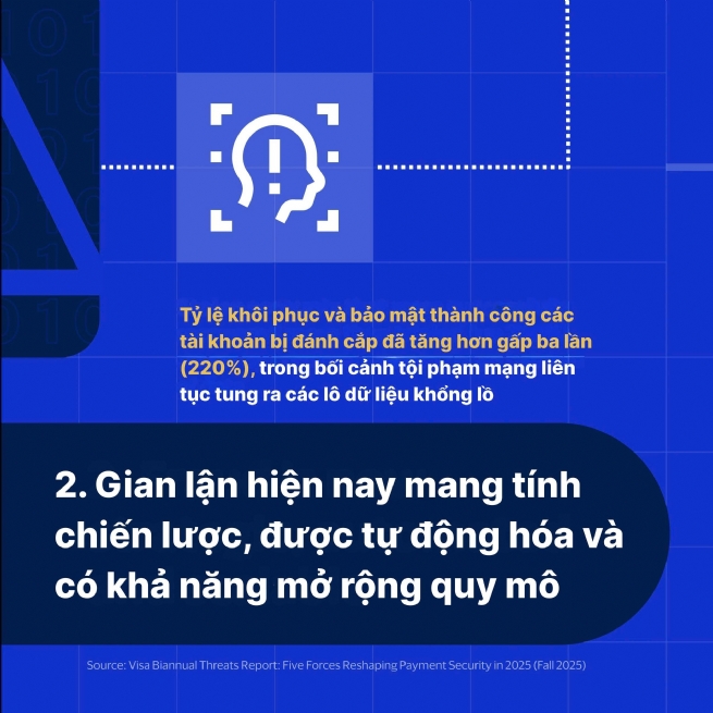 Những sự cố an ninh mạng, như rò rỉ dữ liệu, phát tán mã độc và lừa đảo giả mạo đang trực tiếp tiếp tay cho gian lận, thông qua việc xâm phạm dữ liệu trên diện rộng và khai thác lỗ hổng danh tính. Những lô dữ liệu tài khoản bị đánh cắp được tung ra thị trường theo cách tiếp cận mang tính công nghiệp hóa, bao gồm cả các mô hình “gian lận như một dịch vụ” (fraud-as-a-service). Trong năm 2025, số lượng tài khoản bị đánh cắp nhưng được khôi phục và bảo mật thành công đã tăng hơn gấp ba lần (220%⁵).