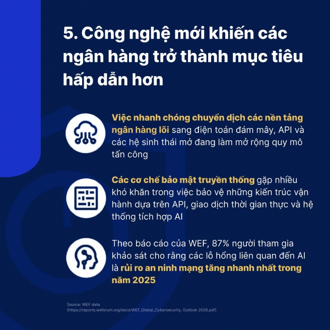 Theo Báo cáo Triển vọng An ninh mạng Toàn cầu 2026 của Diễn đàn Kinh tế Thế giới (WEF), 65% các tổ chức lớn hiện coi lỗ hổng từ bên thứ ba và chuỗi cung ứng là thách thức lớn nhất đối với khả năng chống chịu an ninh mạng, tăng mạnh từ 54%⁸ năm 2025. Con số này cho thấy sự gia tăng nhanh chóng của các cuộc tấn công thông qua chuỗi cung ứng. Trên thực tế, một cuộc tấn công nhằm vào hệ thống khách hàng thân thiết của ngân hàng không dừng lại ở việc đánh cắp dữ liệu điểm thưởng, mà còn có thể làm lộ thông tin thẻ, lịch sử tín dụng và nhiều dữ liệu cá nhân nhạy cảm khác.