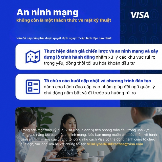 Thời điểm để hành động là ngay lúc này. Các tổ chức có thể bắt đầu bằng việc thực hiện đánh giá mức độ trưởng thành về an ninh mạng, kết hợp với đánh giá an ninh chuỗi cung ứng, nhằm xây dựng một bức tranh tổng thể và toàn diện về mức độ phơi nhiễm rủi ro cũng như năng lực phòng vệ của doanh nghiệp. Đội ngũ Tư vấn và Phân tích của Visa (VCA) đã triển khai cách tiếp cận này cho nhiều khách hàng và đối tác tại khu vực châu Á – Thái Bình Dương. Danh mục dịch vụ tư vấn của chúng tôi còn bao gồm đánh giá kiến trúc bảo mật, các buổi trao đổi chuyên sâu dành cho Lãnh đạo cấp cao, các chương trình đào tạo an ninh mạng theo chuyên đề – được xây dựng dựa trên các mối đe dọa thực tế như AI và điện toán lượng tử – cùng các giải pháp tình báo an ninh mạng và phân tích hành vi, nhằm nâng caonhận thức, tăng cường trách nhiệm và củng cố mức độ sẵn sàng của tổ chức.