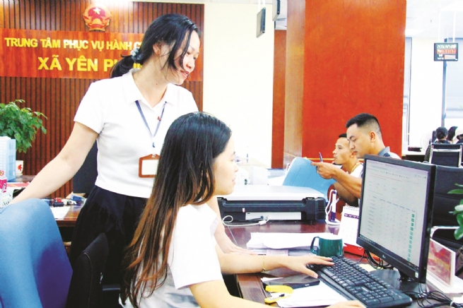 Cán bộ Trung tâm Phục vụ hành chính công xã Yên Phong hỗ trợ người dân giải quyết thủ tục