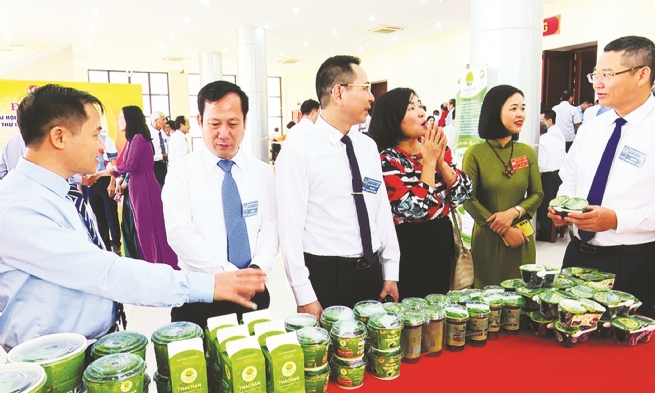 Lãnh đạo xã Yên Phong tham quan gian hàng trưng bày sản phẩm địa phương, khẳng định cam kết đồng hành và hỗ trợ phát triển kinh tế nông thôn bên cạnh dòng chảy công nghiệp
