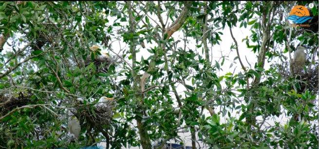 Du khách sẽ dễ dàng bắt gặp hàng loạt tổ chim lơ lửng trên nhánh cây tràm đã trĩu nặng