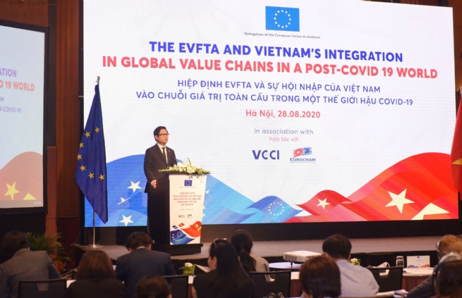T.S Vũ Tiến Lộc, Chủ tịch Phòng Thương mại và Công nghiệp Việt Nam (VCCI) đã chia sẻ xung quanh vấn đề này bên lề Hội thảo "Hiệp định EVFTA và sự hội nhập của Việt Nam vào chuỗi giá trị toàn cầu trong một thế giới hậu Covid-19”. Sự kiện do Phái đoàn Ủy Ban Châu Âu (EC) phối hợp VCCI và Phòng Thương mại và Công nghiệp Châu Âu (EuroCham) tổ chức vừa qua tại Hà Nội. Giang Tú thực hiện.
