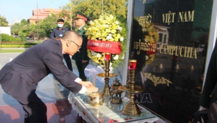 Tại Campuchia, sáng 31/8, Đại sứ quán Việt Nam tổ chức lễ đặt vòng hoa tại Đài Hữu nghị Việt Nam-Campuchia ở thủ đô Phnom Penh nhân kỷ niệm 75 năm Quốc khánh 2/9.