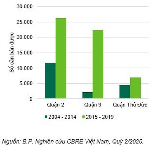 Từ năm 2018, CBRE nhận thấy giá trên thị trường thứ cấp đã tăng đáng kể khi tuyến metro đang dần hoàn thiện, với mức giá chào bán lại cao hơn 25%-75% so với giá bán khởi điểm ban đầu. Trong giai đoạn 2020-2025, nguồn cung chào bán mới tại Thành phố Phía Đông sẽ khá dồi dào, với tốc độ tăng trưởng trung bình hàng năm là 11,5%, tương đương 15.000 – 16.000 căn hộ mới mỗi năm, vượt trội tốc độ tăng trưởng nguồn cung tại khu Nam (4,6%) và khu Tây (5,3%) của TP.HCM.