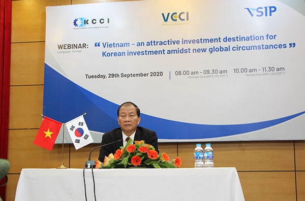 Ngày 29/9/2020 đã diễn ra Tọa đàm trực tuyến: “Việt Nam – điểm đến đầu tư hấp dẫn cho các nhà đầu tư Hàn Quốc trong bối cảnh mới” do Phòng Thương mại và Công nghiệp Việt Nam (VCCI) chủ trì, phối hợp Phòng Thương mại và Công nghiệp Hàn Quốc (VCCI), Tập đoàn Khu Công nghiệp VSIP tổ chức. Tọa đàm thu hút sự tham dự của hơn 100 đại biểu là các doanh nghiệp Hàn Quốc tại Việt Nam đang có nhu cầu mở rộng đầu tư kinh doanh cũng như các doanh nghiệp tại Hàn Quốc đang mong muốn tìm hiểu về cơ hội đầu tư tại Việt Nam.