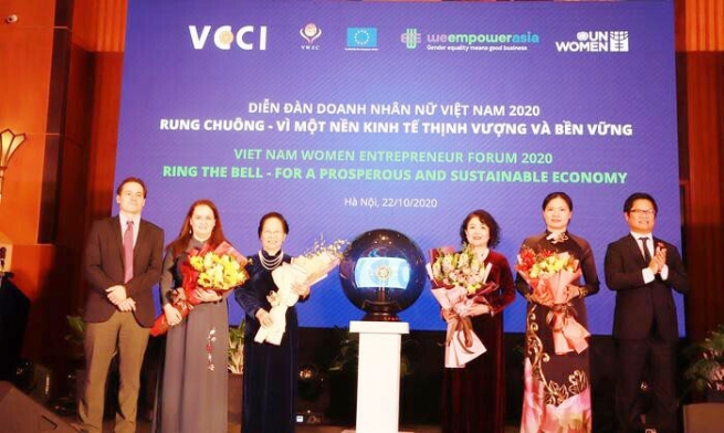 Diễn đàn doanh nhân nữ Việt Nam 2020 và lễ “Rung chuông Vì một nền kinh tế thịnh vượng và bền vững” vừa được tổ chức tại Hà Nội. Đây là sáng kiến của VCCI, Hội đồng Doanh nhân nữ, UN WOMEN và Phái đoàn Liên minh Châu Âu tại Việt Nam nhằm kêu gọi cộng đồng doanh nghiệp chung tay thúc đẩy khu vực tư nhân trong việc thực hiện bình đẳng giới – điều kiện quan trọng để đạt được các mục tiêu phát triển bền vững của Liên Hợp Quốc cũng như đảm bảo phát triển thịnh vượng và bền vững của các doanh nghiệp, của nền kinh tế.
