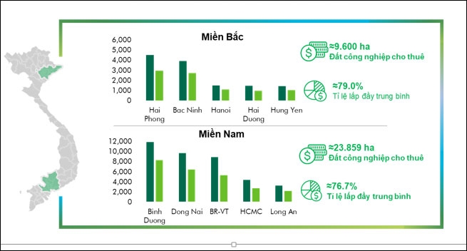 Tỷ lệ lấp đầy trung bình của khu công nghiệp duy trì ở mức tích cực 79%. Trong đó, các khu công nghiệp tại Hà Nội, Hải Dương và Bắc Ninh đạt tỷ lệ lấp đầy trung bình khoảng 90%. Đối với thị trường Miền Nam, tổng diện tích đất công nghiệp gấp đôi thị trường miền Bắc, đạt mức khoảng 38.000ha trong đó 24.000ha đất công nghiệp cho thuê bao gồm Hồ Chí Minh, Bình Dương, Long An, Đồng Nai, Bà Rịa- Vũng Tàu với mức tỷ lệ lấp đầy trung bình đạt gần 77%. Tuy nhiên, CBRE ghi nhận nguồn cung đất công nghiệp sẵn sàng bàn giao ngay tại các khu công nghiệp tại cả hai miền đều trong tình trạng khan hiếm.