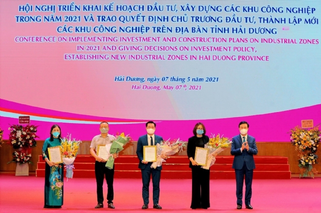 Bí thư Tỉnh ủy Hải Dương - ông Phạm Xuân Thăng trao quyết định chủ trương đầu tư Khu công nghiệp Gia Lộc cho bà Phạm Hồng Thúy - Tổng Giám đốc TNI Holdings Vietnam