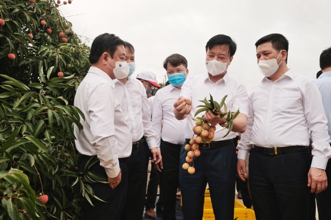 Bí thư Tỉnh ủy Hải Dương - ông Phạm Xuân Thăng giới thiệu vải thiều Thanh Hà cho Bộ trưởng Bộ Nông nghiệp và Phát triển nông thôn và Bộ trưởng Bộ Công Thương