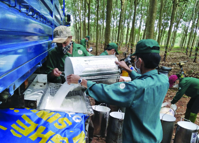 Công nhân Nông trường Bình Ba giao nhận mủ cao su tại vườn cây