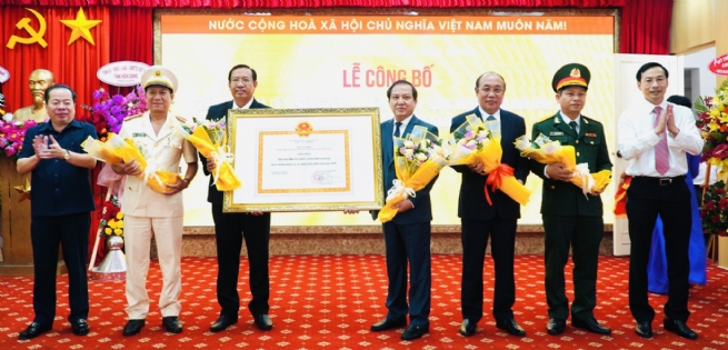 Ông Mai Văn Huỳnh (bìa trái), Chủ tịch HĐND tỉnh Kiên Giang và ông Nguyễn Thanh Nhàn (bìa phải), Phó Chủ tịch UBND tỉnh Kiên Giang trao quyết định của Thủ tướng Chính phủ công nhận TP.Hà Tiên hoàn thành nhiệm vụ xây dựng nông thôn mới và đón nhận Huân chương Lao động hạng Ba