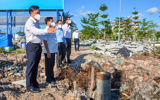 Chủ tịch UBND tỉnh Cà Mau Huỳnh Quốc Việt (bìa trái) kiểm tra thi công Dự án ĐTXD Bờ Kè chống sạt lở khu dân cư thị trấn Năm Căn (huyện Năm Căn). Ảnh: Báo Cà Mau.