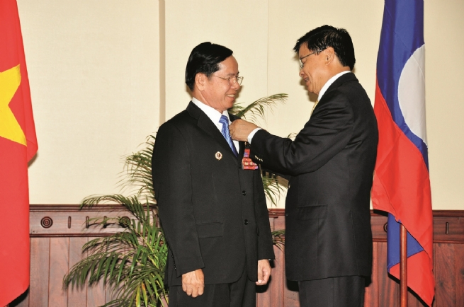 Chủ tịch Quốc hội Lào Pany Yathotou trao tặng Huân chương Lao động cho Anh hùng Lao động Lê Văn Kiểm - Chủ tịch Hội đồng quản trị