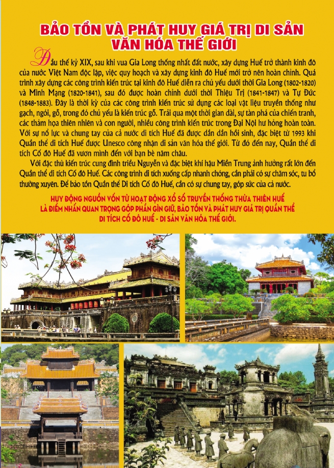 Ông Trần Viết Nguyên, Chủ tịch Công ty TNHH Nhà nước MTV Xổ số kiến thiết Thừa Thiên Huế cho biết: “Chỉ đạo của Thủ tướng Chính phủ tại văn bản số 410/TB-VPCP ngày 29/12/2020 và Quyết định số 1198/QĐ-BTC ngày 21/6/2021 của Bộ Tài chính về việc bổ sung lịch mở thưởng xổ số kiến thiết truyền thống cho Công ty để huy động nguồn vốn cho công tác bảo tồn và phát huy giá trị di sản Cố đô Huế và Quyết định 1811/QĐ-UBND ngày 23/7/2021 của UBND tỉnh phê duyệt một số nội dung triển khai Quyết định 1198/QĐ-BTC của Bộ Tài chính về việc bổ sung lịch mở thưởng xổ số kiến thiết truyền thống vào ngày Chủ nhật hàng tuần, bắt đầu từ ngày 01/01/2022, bên cạnh lịch mở thưởng vào ngày thứ Hai hàng tuần”.