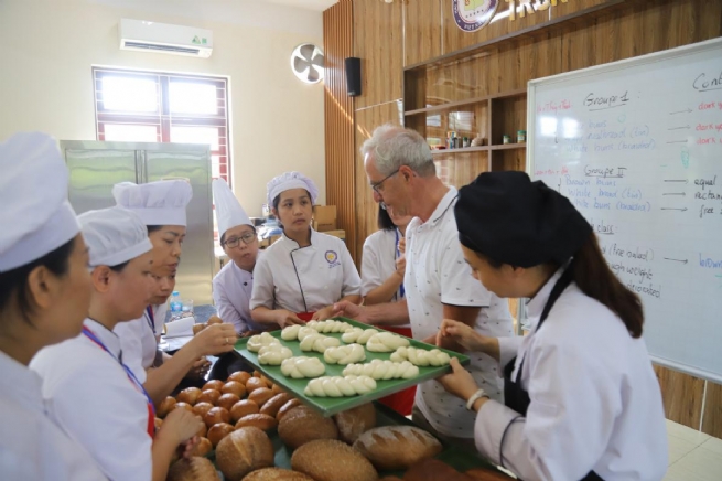 Ông Jan Johannes Zweistra, chuyên gia làm bánh đến từ Hà Lan - nền ẩm thực hàng đầu thế giới, hướng dẫn làm bánh cho các học viên tại Trường Cao đẳng Du lịch Hải Phòng
