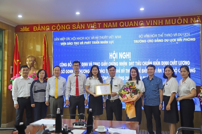 Ban giám hiệu Trường Cao đẳng Du lịch Hải Phòng trong Hội nghị công bố Quyết định và trao Giấy chứng nhận đạt tiêu chuẩn kiểm định chất lượng cơ sở Giáo dục nghề nghiệp và Chương trình đào tạo