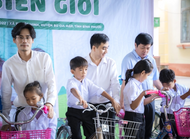 Qua đó, tại lễ trao quà ở UBND xã Phước Minh (H.Bù Gia Mập), các tổ chức, đơn vị ở tỉnh Bình Phước gồm: Hội Hữu nghị Việt Nam - Campuchia, Trung tâm Xúc tiến Đầu tư, Thương mại và Du lịch (TT XTĐT,TM&DL), huyện Đoàn Bù Gia Mập đã phối hợp với Văn phòng phía Nam Tạp chí Nhà đầu tư/Nhadautu.vn tặng hàng chục xe đạp cùng góc họp tập cho con em Việt kiều Campuchia.
