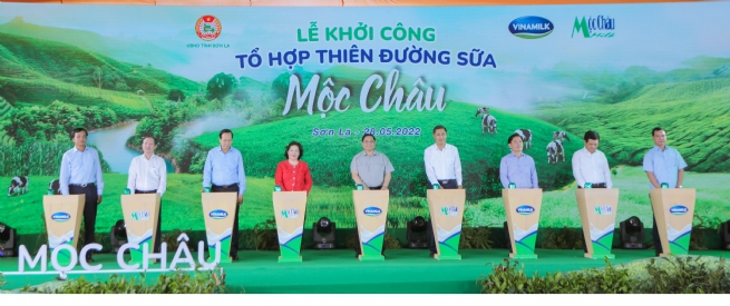 Thủ tướng Chính phủ cùng các đại biểu và lãnh đạo của Vinamilk, Mộc Châu Milk thực hiện nghi thức khởi công Tổ hợp Thiên đường sữa Mộc Châu