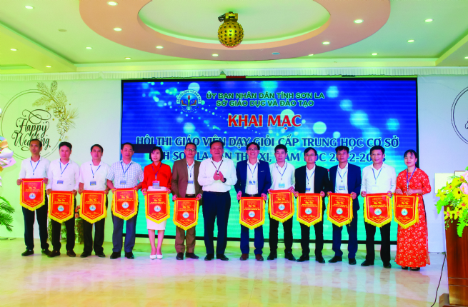 Ông Quàng Văn Lâm, Phó Giám đốc Sở GD&ĐT Sơn La trao Cờ lưu niệm cho 12 đoàn thi đến từ các phòng GD&ĐT các huyện và thành phố Sơn La