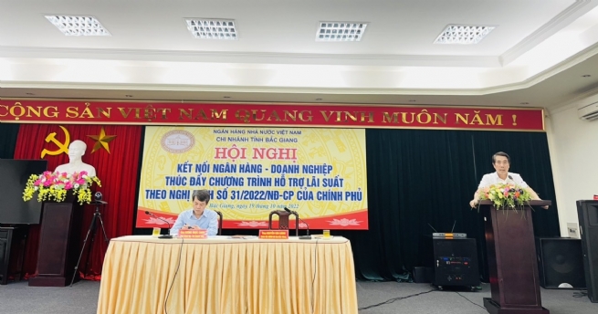 Ngoài ra, NHNN Chi nhánh tỉnh cũng xây dựng Kế hoạch triển khai thực hiện Nghị quyết số 11/NQ-CP ngày 30/01/2022 của Chính phủ về chương trình phục hồi và phát triển kinh tế - xã hội; tích cực cho vay hỗ trợ lãi suất từ NHNN theo Nghị định 31 của Chính phủ và Thông tư 03 của NHNN,… Ngày 19/10/2022, NHNN Chi nhánh tỉnh Bắc Giang đã tổ chức “Hội nghị kết nối Ngân hàng - Doanh nghiệp thúc đẩy triển khai chương trình hỗ trợ lãi suất theo Nghị định số 31/2022/NĐ-CP của Chính phủ”, với gần 40 khách hàng là các doanh nghiệp, hợp tác xã, hộ kinh doanh trên địa bàn tham dự.