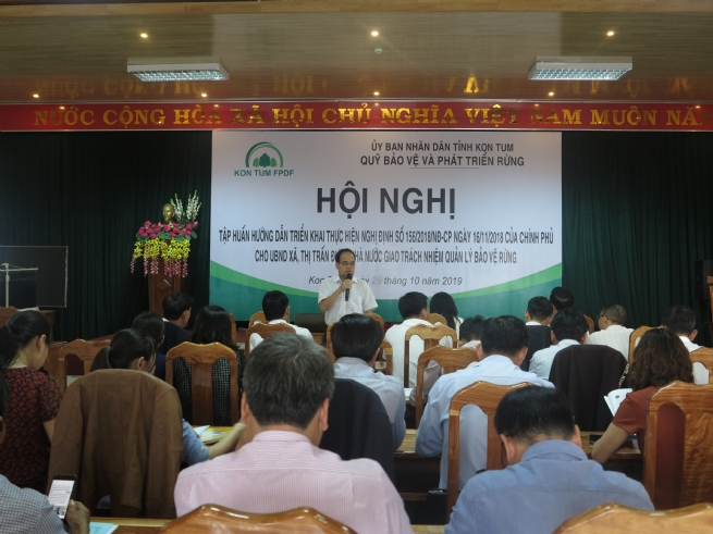 Ông Hồ Thanh Hoàng, Giám đốc Quỹ BV&PTR tỉnh Kon Tum phát biểu tại Hội nghị tập huấn hướng dẫn cho UBND các xã, thị trấn được Nhà nước giao trách nhiệm quản lý, bảo vệ rừng