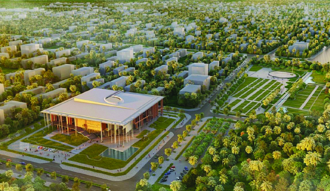 Phối cảnh quần thể kiến trúc Trung tâm Hội nghị và Triển lãm tỉnh Quảng Ngãi do Ban Quản lý dự án đầu tư xây dựng các công trình dân dụng và công nghiệp tỉnh Quảng Ngãi làm chủ đầu tư