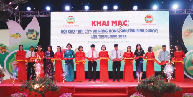 Bí thư Tỉnh ủy Bình Phước - ông Nguyễn Mạnh Cường và các đại biểu cắt băng khai mạc Hội chợ trái cây và hàng nông sản tỉnh Bình Phước