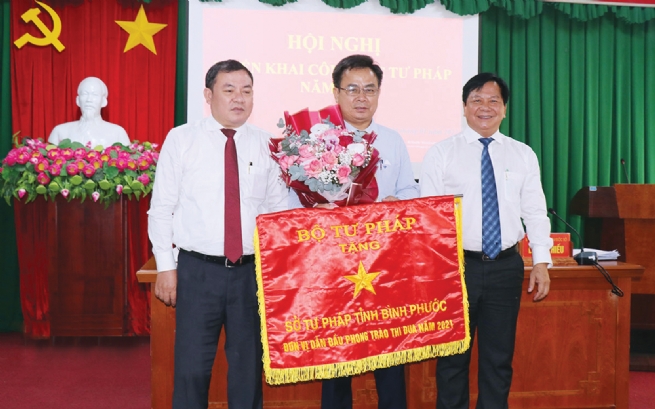 Phó Chủ tịch UBND tỉnh Bình Phước - ông Trần Văn Mi và Cục trưởng Cục công tác phía Nam, Bộ Tư pháp - ông Nguyễn Thanh Bình trao Cờ thi đua của Bộ Tư pháp