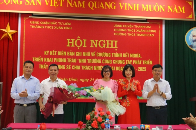 Đến dự buổi giao lưu, kết nghĩa, về phía lãnh đạo có: Thầy giáo Nguyễn Hữu Hải - Phó Trưởng phòng Giáo dục và Đào tạo quận Bắc Từ Liêm, thầy giáo Nguyễn Đức Lượng – Phó Trưởng phòng giáo dục đào tạo huyện Thanh Oai, các đồng chí là cán bộ, chuyên viên của Phòng Giáo dục và Đào tạo. Đồng thời, về phía ba nhà trường có: Cô giáo Lê Thị Na - Hiệu trưởng Trường THCS Xuân Dương - Thanh Oai; thầy giáo Nguyễn Đăng Tuấn - Hiệu trưởng Trường THCS Thanh Cao - Thanh Oai; cô giáo Lê Thị Thu Hà - Bí thư chi bộ, Hiệu trưởng Trường THCS Xuân Đỉnh - cùng đại diện các thầy giáo, cô giáo trong Hội đồng Sư phạm của ba nhà trường.