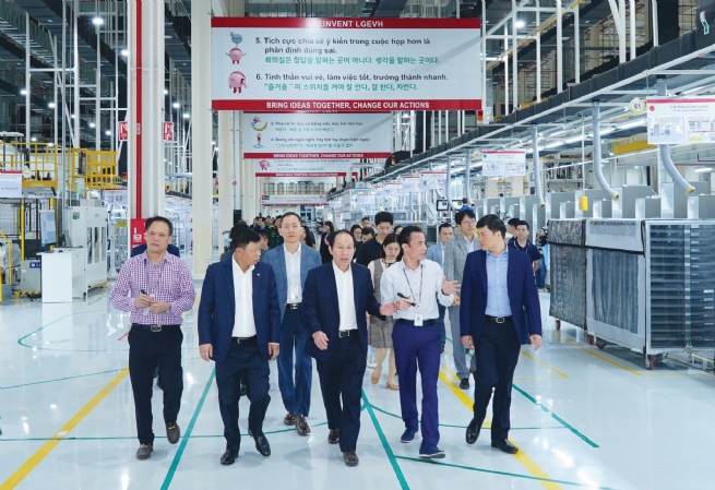 Ủy viên Trung ương Đảng, Bí thư Thành ủy Lê Tiến Châu cùng lãnh đạo thành phố Hải Phòng tham quan nhà xưởng của Tập đoàn LG trong KCN Tràng Duệ
