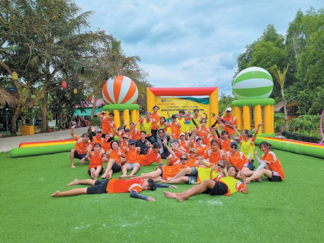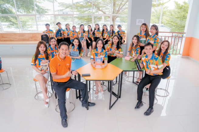 Thầy Trần Lý Anh Tuấn (áo cam) và đội ngũ cán bộ trẻ trung, nhiệt huyết