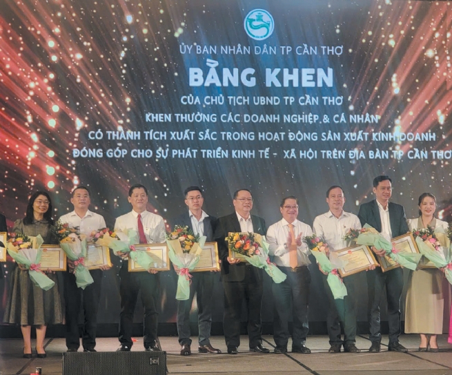 Ông Phạm Thế Dũng, Chủ tịch Công ty (thứ ba từ phải sang) nhận Bằng khen của UBND TP.Cần Thơ